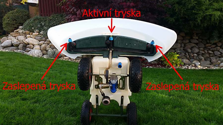 Postřikovací ramena: 2 metry široká postřikovací ramena se čtyřmi tryskami